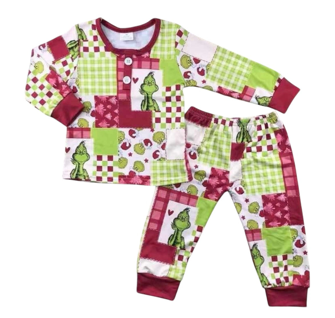 Boys and girls Grinch pyjamas. 95% cotton 5% spandex