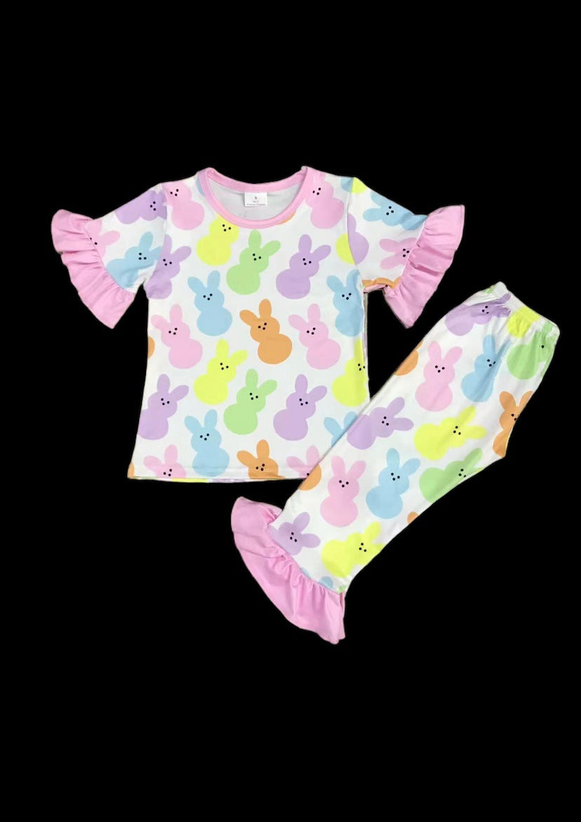 Girls bunny print frill sleeved pyjamas. Milk silk material. 95% spandex 5% cotton