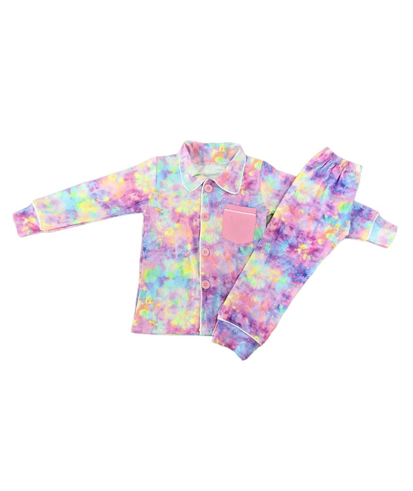 Girls tie dye multi colour pyjamas. Milk silk material. 95% spandex 5% cotton