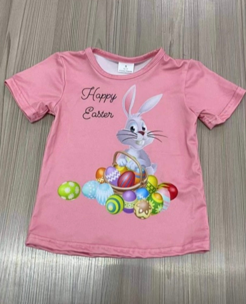 Pink children’s Happy Easter T-shirt. Milk silk material. 95% cotton 5% spandex